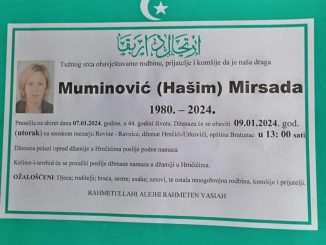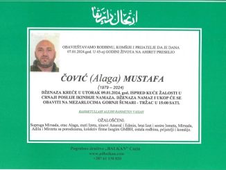 OBAVJEŠTAVAMO RODBINU, KOMŠIJE I PRIJATELJE DA JE DANA 07.01.2024.god. U 45-oj GODINI ŽIVOTA NA AHIRET PRESELIO ČOVIĆ (Alaga) MUSTAFA (1979-2024) DŽENAZA KREĆE U UTORAK 09.01.2024. […]