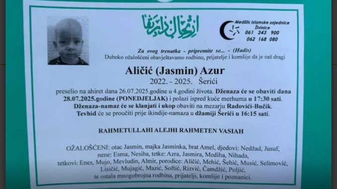 Duboka tuga zavila je mjesto Šerići kod Zenice nakon vijesti da je u svojoj četvrtoj godini života preselio Azur Aličić, sin Jasmina i Jasminke. Dječak je preminuo 26. jula 2025. godine, nakon duže i teške borbe s leukemijom.
